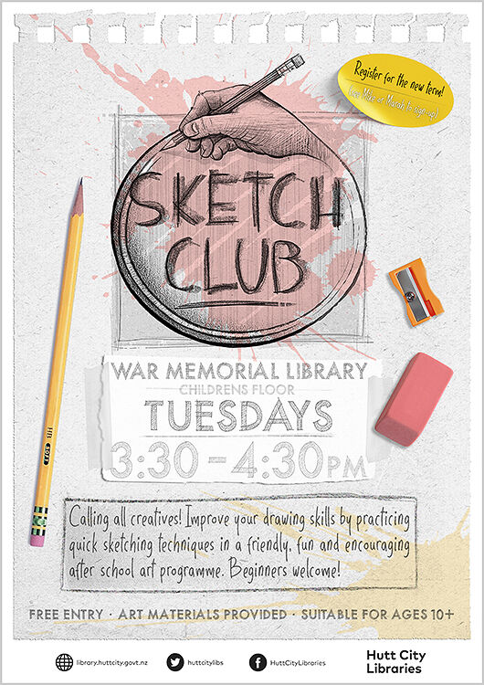 Image details: Poster design for Sketch Club, the weekly after school art programme I currently run at a library in Wellington, NZ.